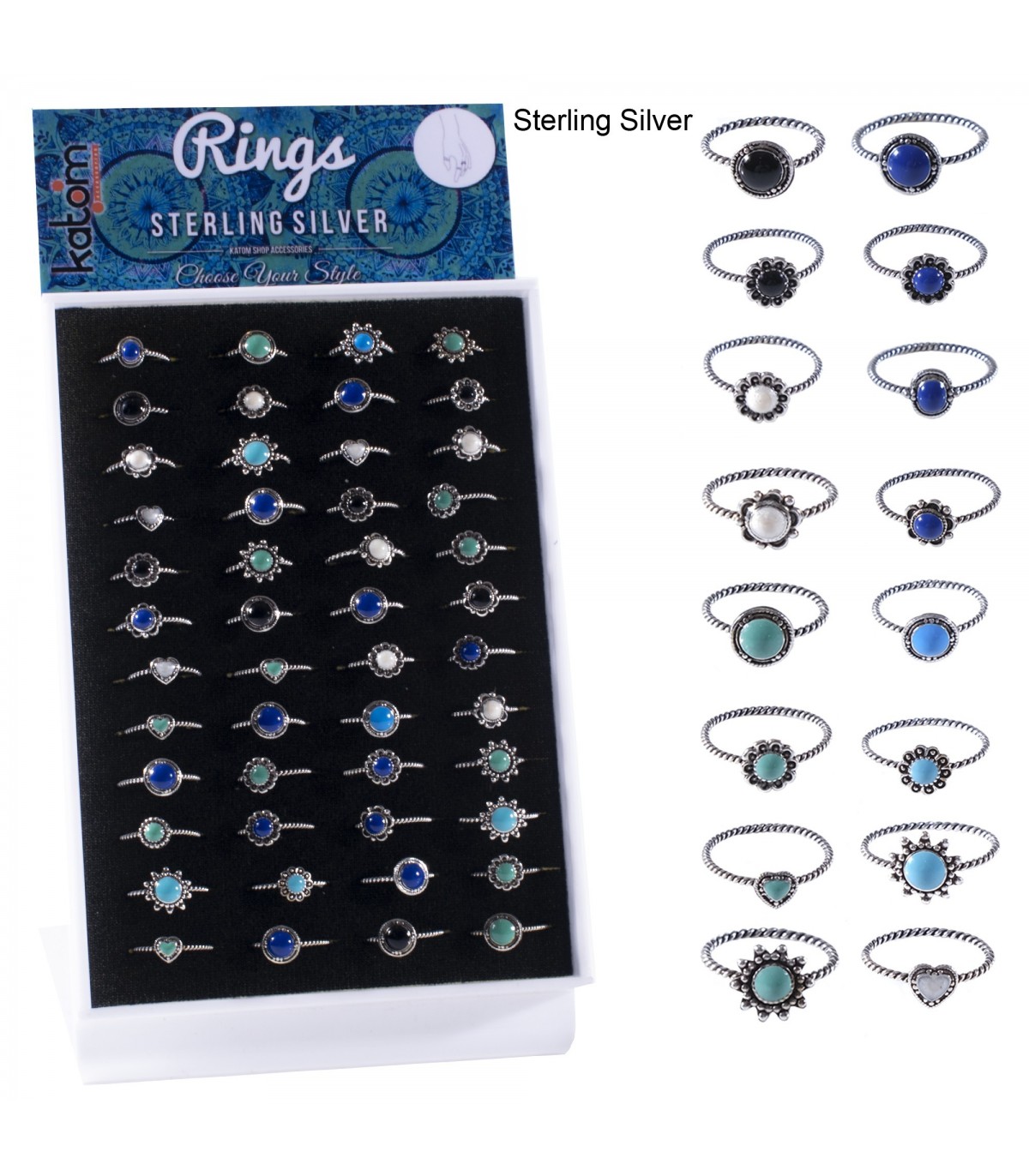 Présentoir de bagues en argent, plusieurs modèles dont certains avec émail.