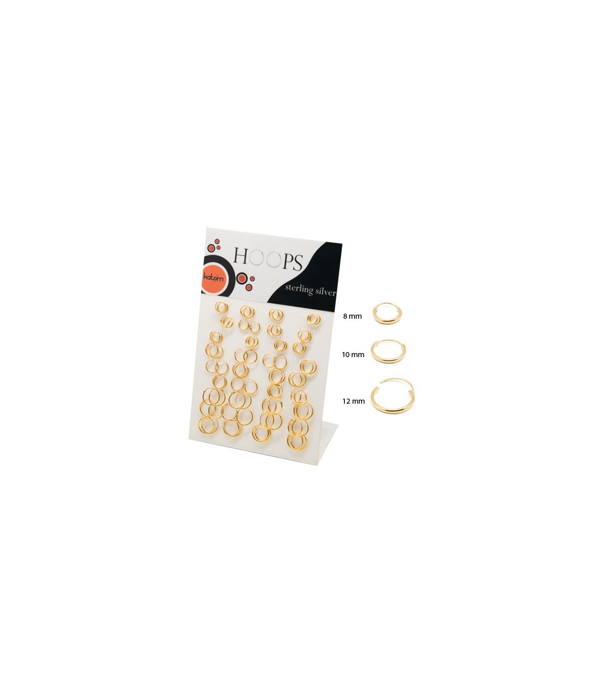 Présentoir de cerceaux en argent et argent plaqué en or de 18 K dont la barre est de 3 mm de largeur; plusieurs tailles 14,16, 18 et 20 mm.