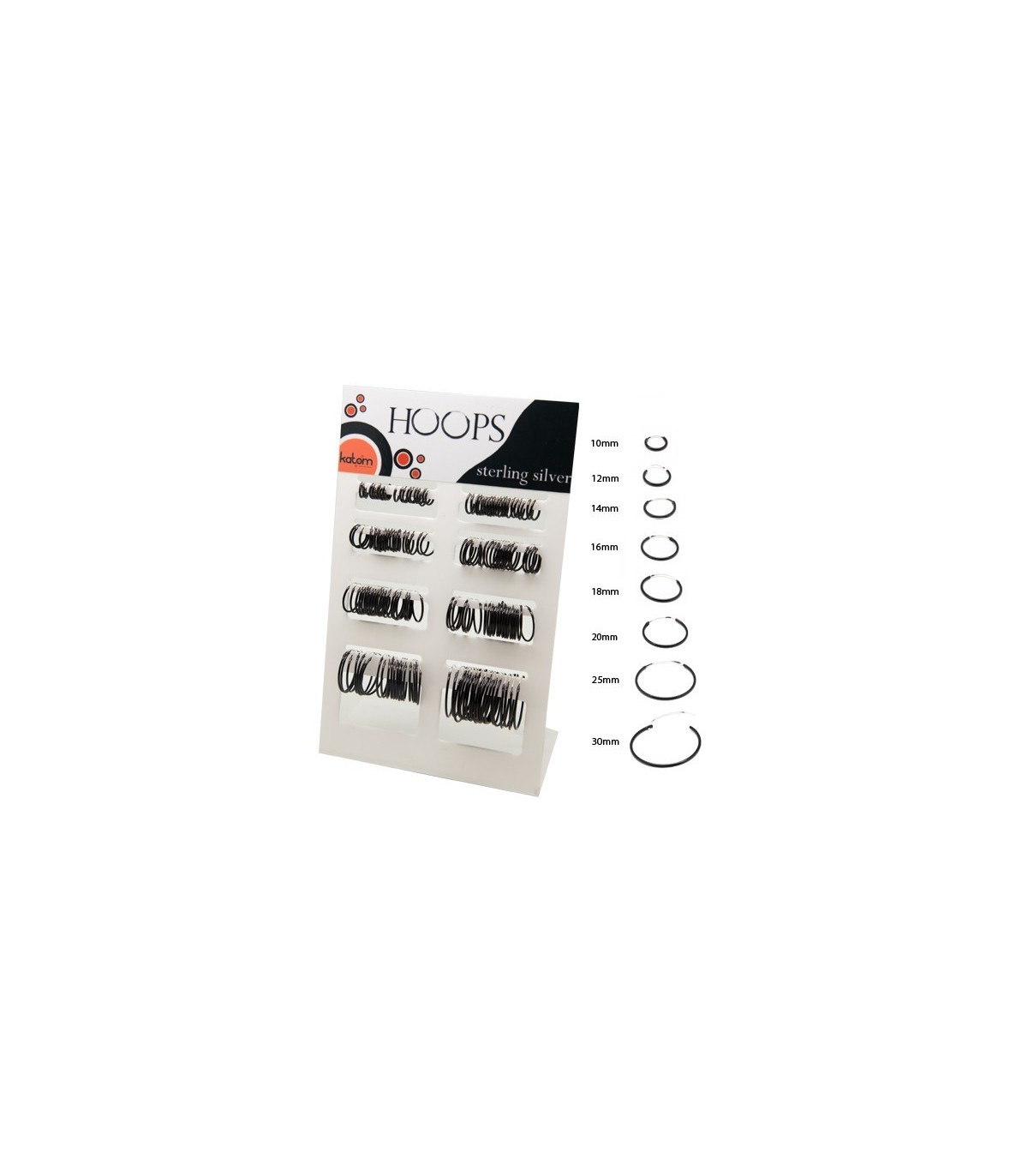 Exposant de cerceaux de différentes tailles. Argent sterling, plaqué or. 8 tailles différentes: 10mm, 12mm, 14mm, 16mm, 18mm, 20mm, 25mm, 30mm. Unisexe.96 unités exposant.