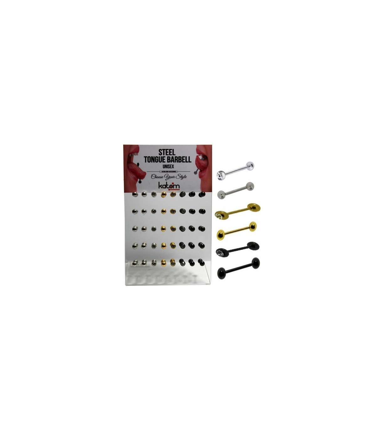 Exposant piercing de langue d'acier . Avec et sans crystal. En 3 couleurs métalliques. Boule lisse.