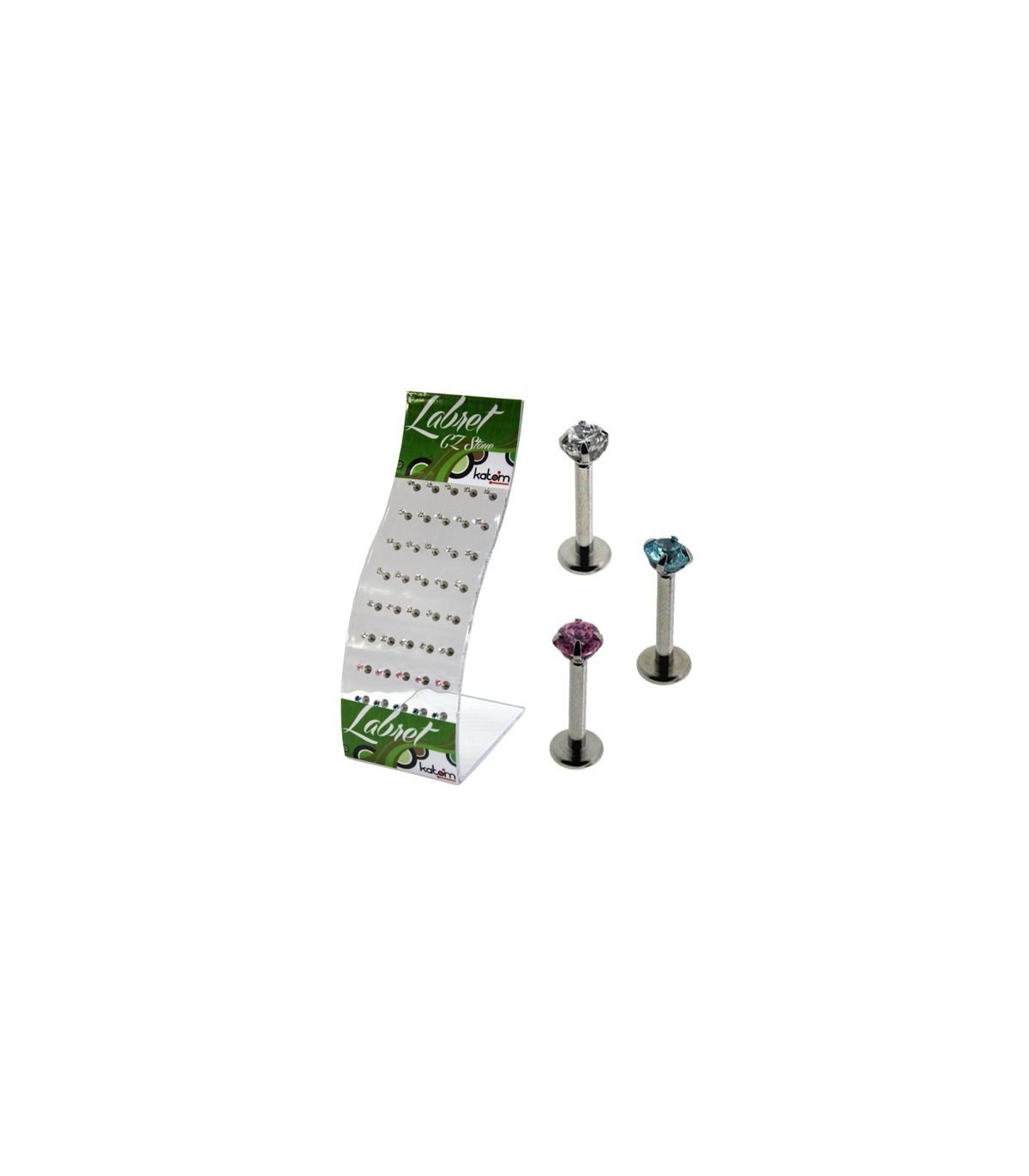 Exposant piercings lèvres, labret. Acier chirurgical avec de la pierre de verre. 3 couleurs différentes. Filetage intérieur