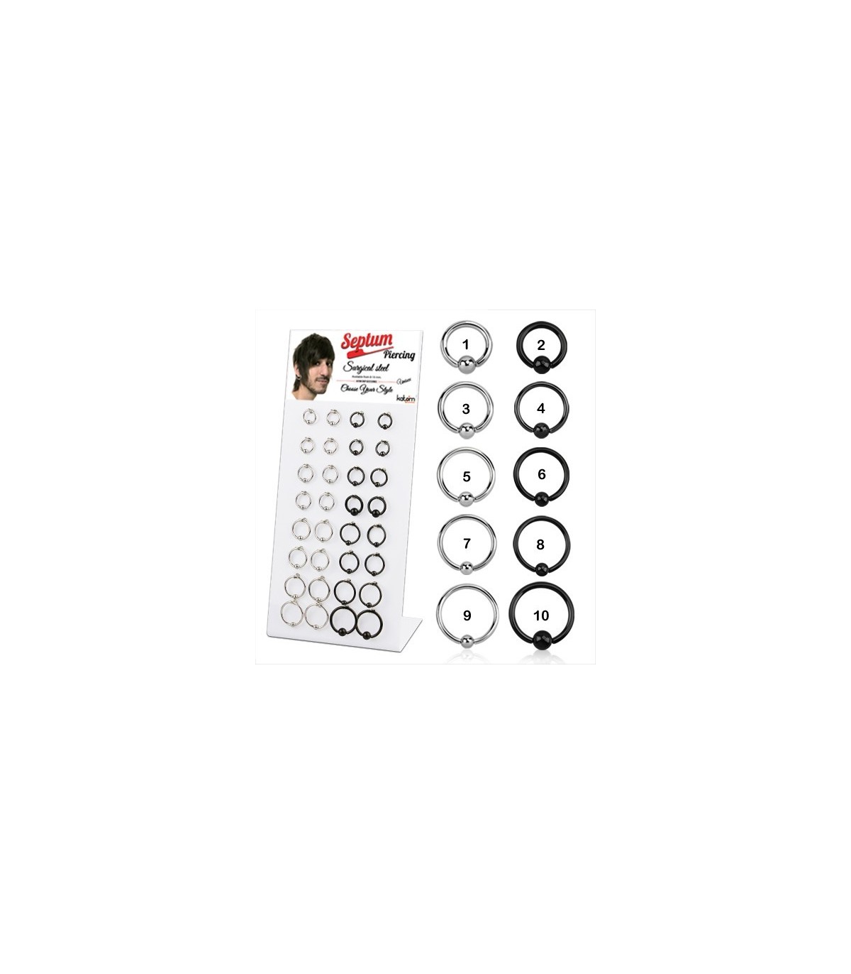 Présentoir de piercing pour le Septum en acier chirurgical dont diamètre de la tige 1.2 mm et diamètre 8mm, 6 modèles: