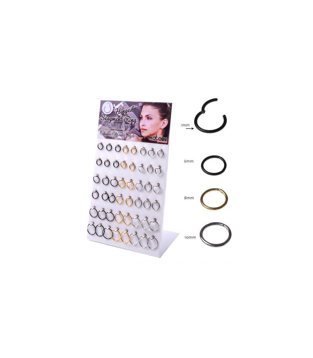 Présentoir d'anneaux en acier à charnière avec fermeture clicker, dont les mesures barre de 1,2 mm et diamètre de 8 mm, en trois couleurs (acier, noir et doré) à être utilisé comme piercing pour le Tragus, l'Helix, la...