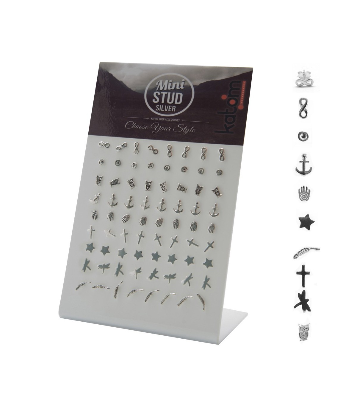 Présentoir de 16 modèles de boucles d'oreille en argent Ear Pin grimpeur, dont le design est très orginal.