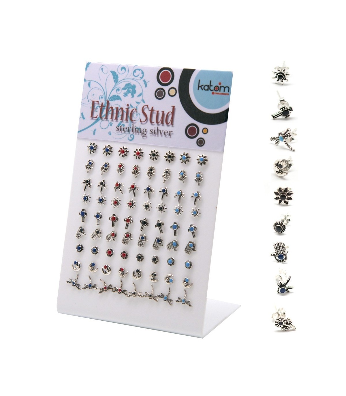 Exposant de boucles d'oreilles avec des symboles ethniques et des designs modernes avec de la pierre de couleur dans le centre. 9 modèles différents. 4 couleurs.