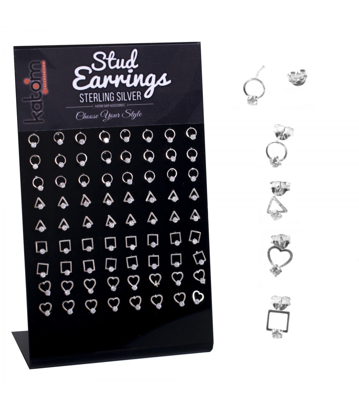 Exposant boucles d'oreilles en argent avec crystal noir serti en forme ronde ou carrée. Différentes tailles. 3, ,4, ,5, ,6, 7, 8, 9 mm72 unités par exposant.