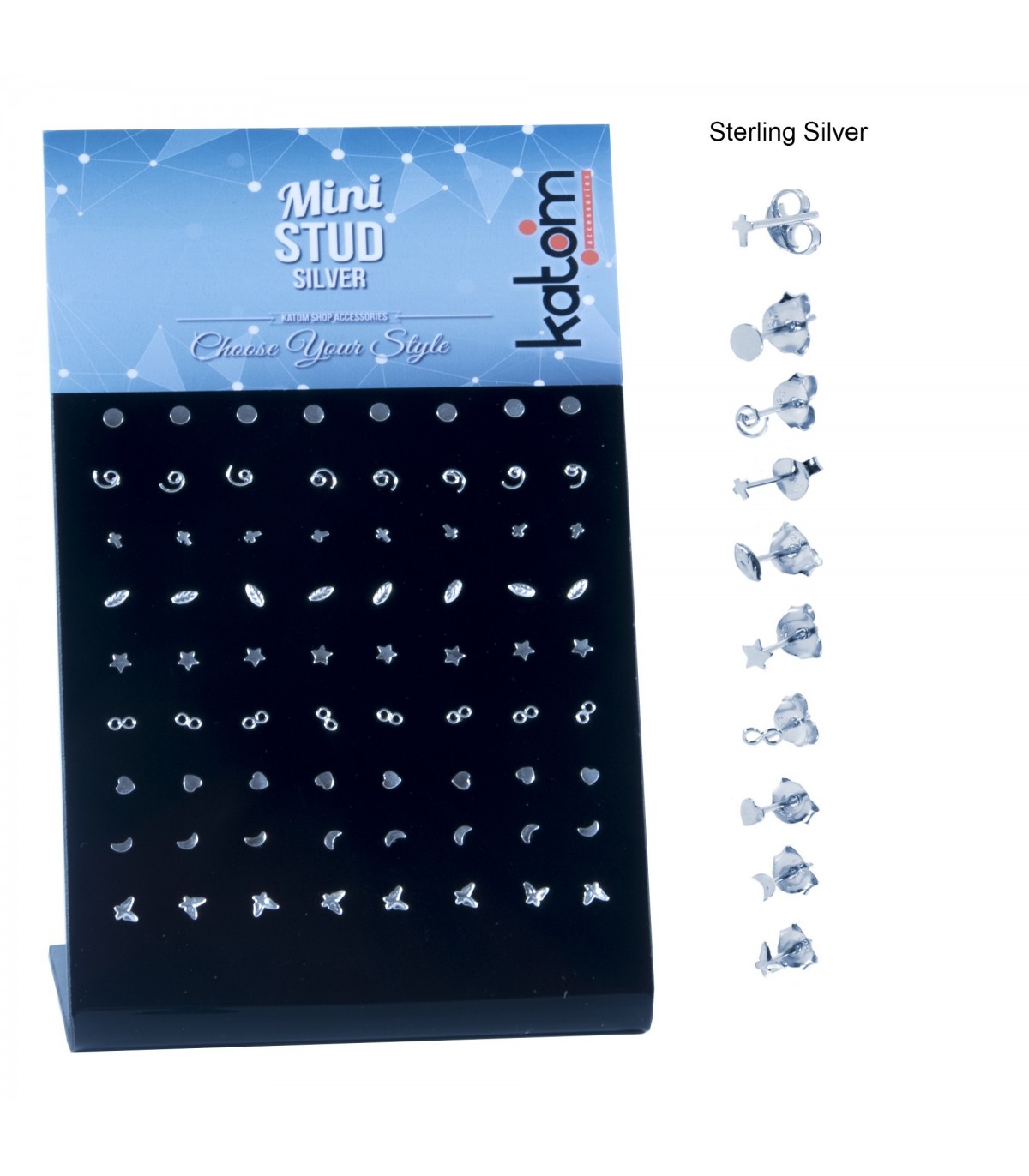 Exposant boucles d'oreilles en argent avec perles combinée à des conceptions classiques et modernes. Différentes formes et modèles. Pour tous les âges.6 modèles différents(72 unités par exposant)