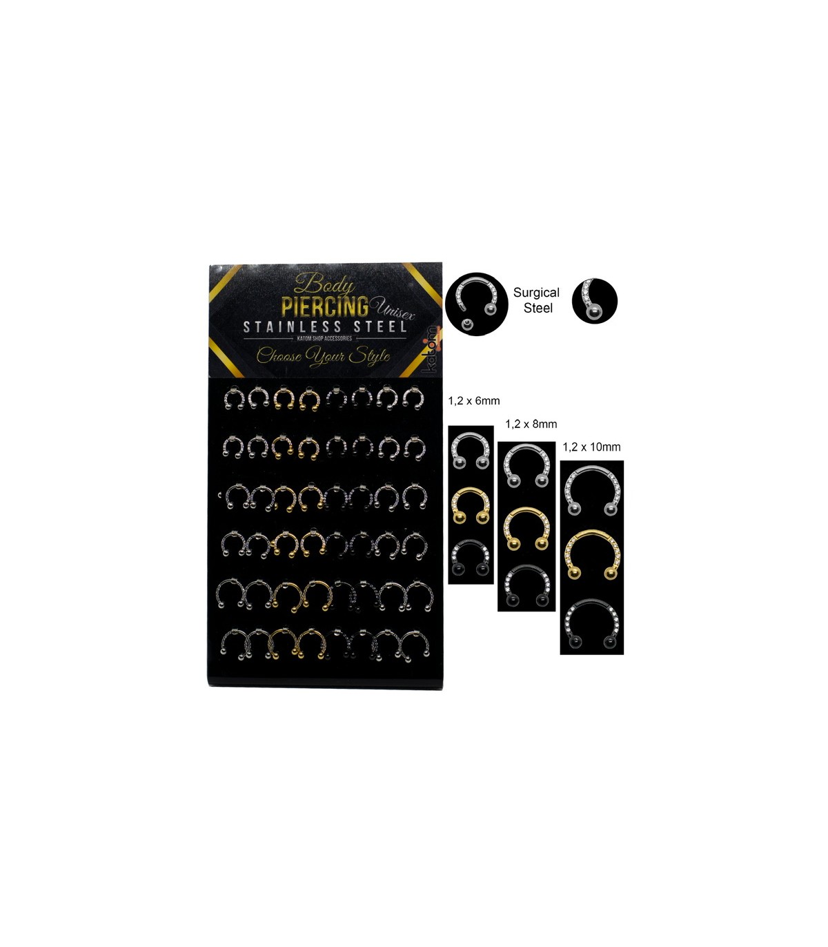 Présentoir de piercing en acier chururgical qui peut être utilisé comme boucle d'oreille.Barre de 1,2 mm de largeur sur 6 mm; sur le frontal variété de designs modernes.