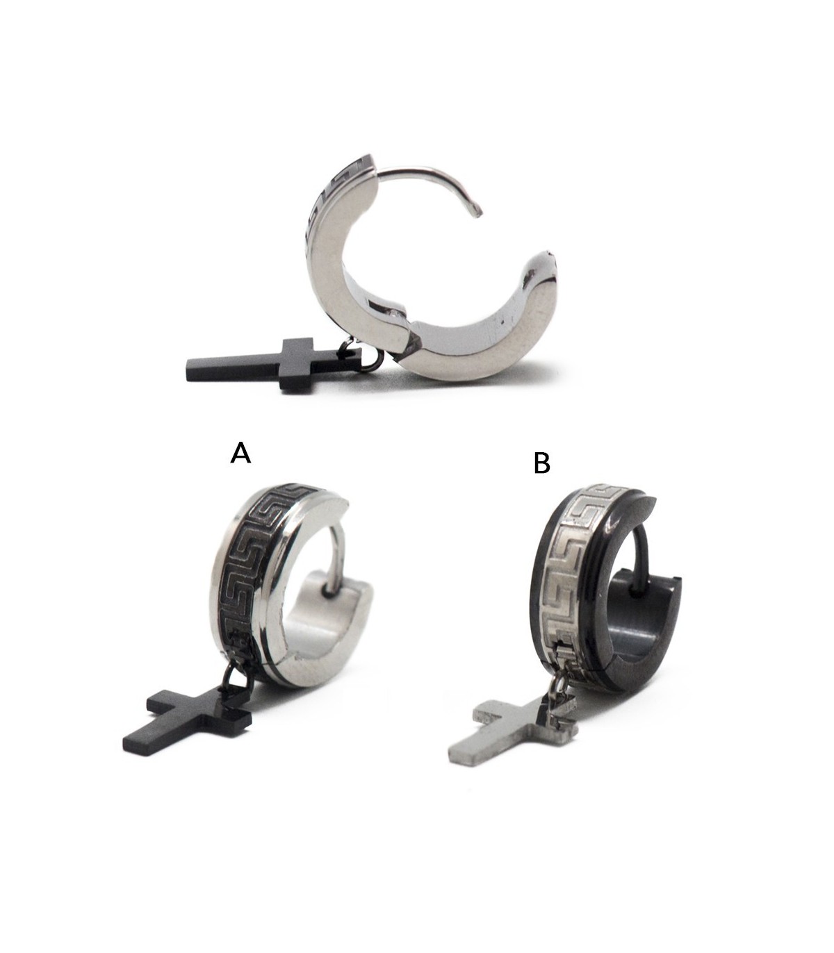 Steel earring Hoop type, carved edge, with hanging cross.