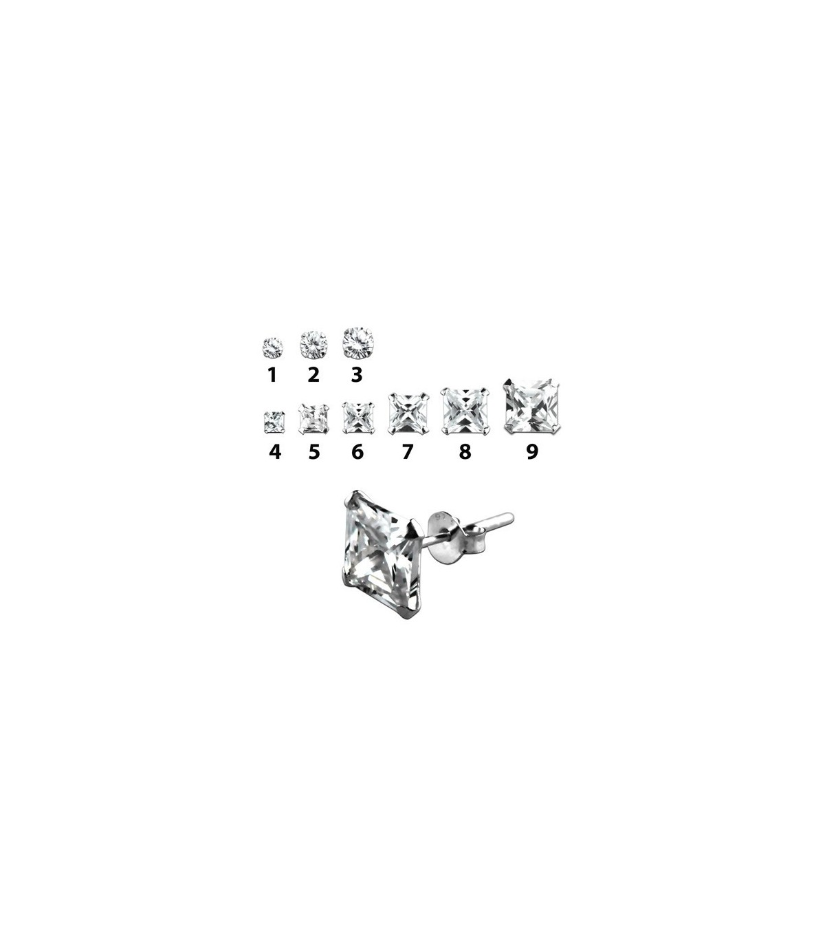 Round and square white zirconite sterling silver earring; Mini sizes of 2, 2.5, 3 and 4 mm.