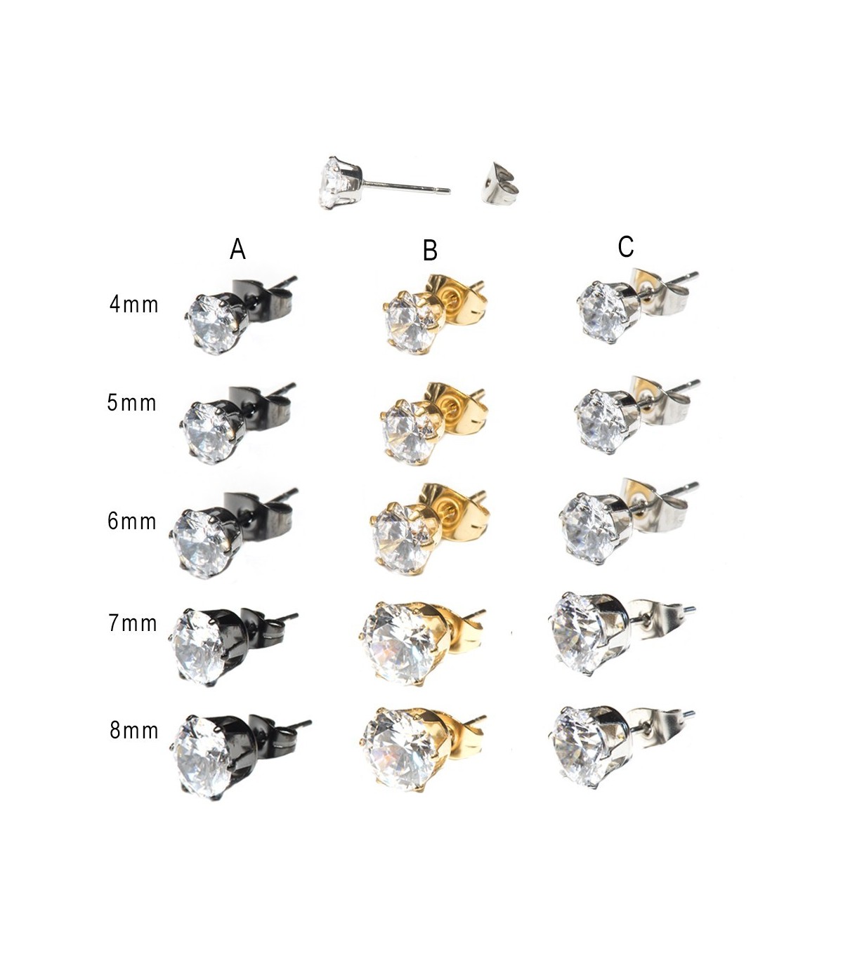 Pendiente redondo de acero en color acero, negro odorado con circonita blanca y cinco tamaños, de 4 mm a 8 mm.
