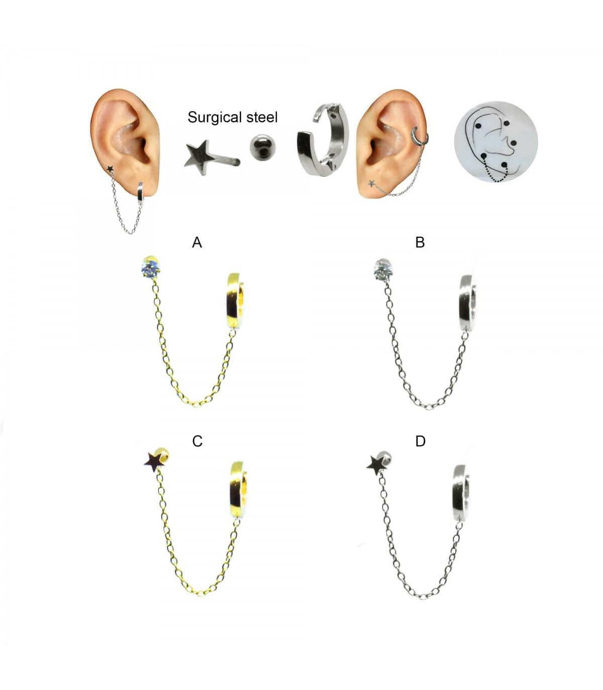 Aros de acero con cadena y pendiente que puede usarse como pendiente normal o como ear cuff