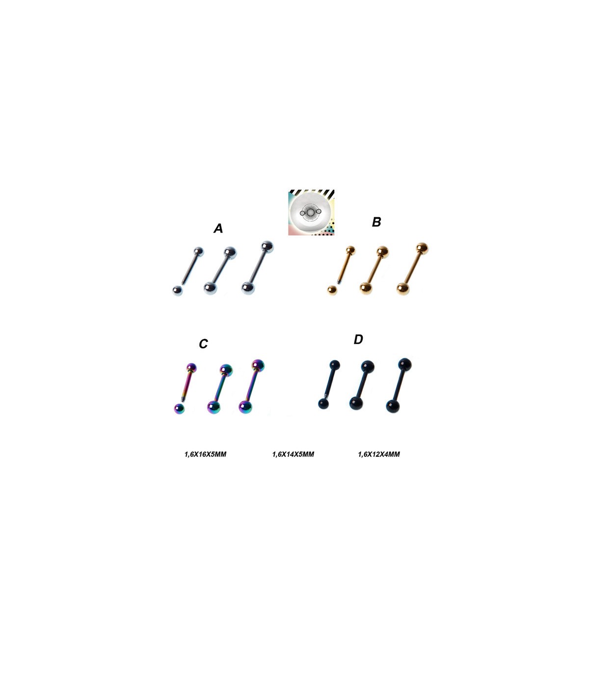 Piercing de acero para pezón básico, compuesto de una barra de 1,6 mm de ancho, en cuatro colores: A- acero, B- dorado, C- arco iris y D- negro.