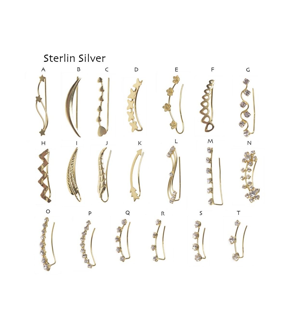 Pendiente trepador Ear Pin de plata de ley chapados en oro de 18 quilates con diseños especiales y actuales, alguno de ellos con piedras Swarovski.
