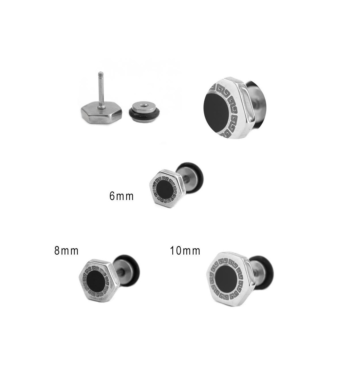Falsa dilatación de acero hexagonal con centro circular esmaltado negro y greca.