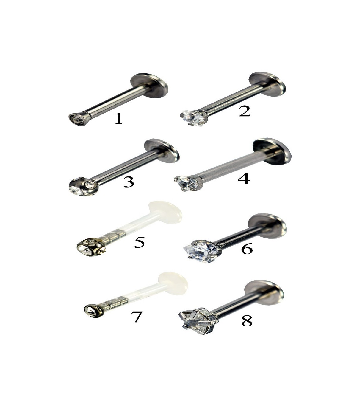 Piercing de labio en acero quirurgico y cristal engarzado. Largo de la barra 8 milimetro. 8 modelos diferentes