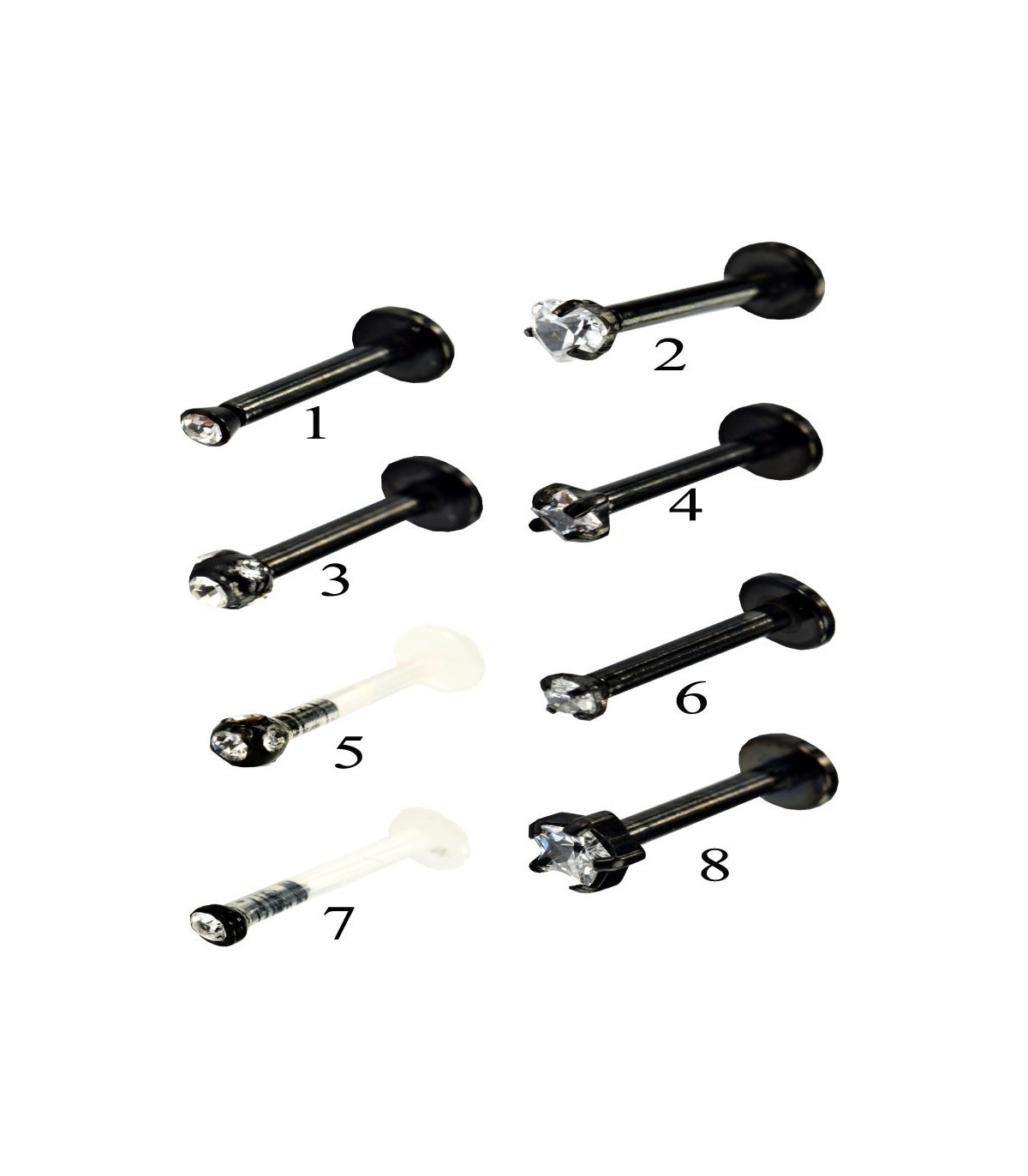 Piercing de labio en acero quirurgico y cristal engarzado. Largo de la barra 8 milimetro. 8 modelos diferentes