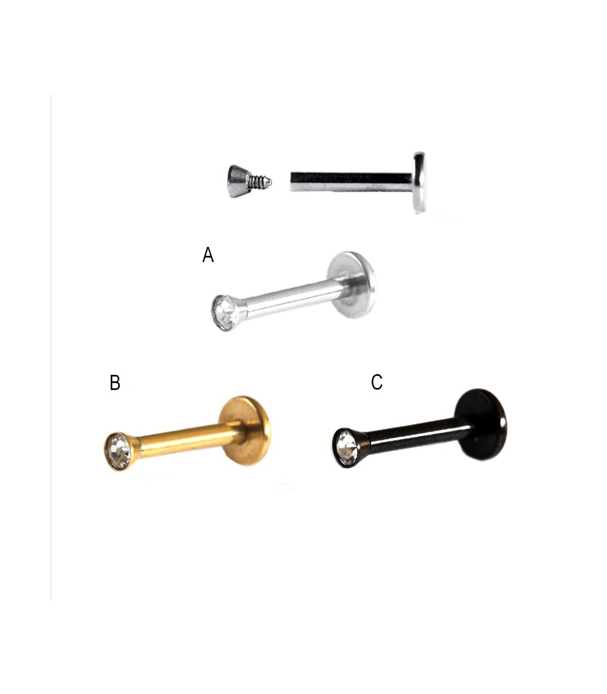 Piercing de acero para labio en colores acero, negro y dorado con circonita blanca enroscada.