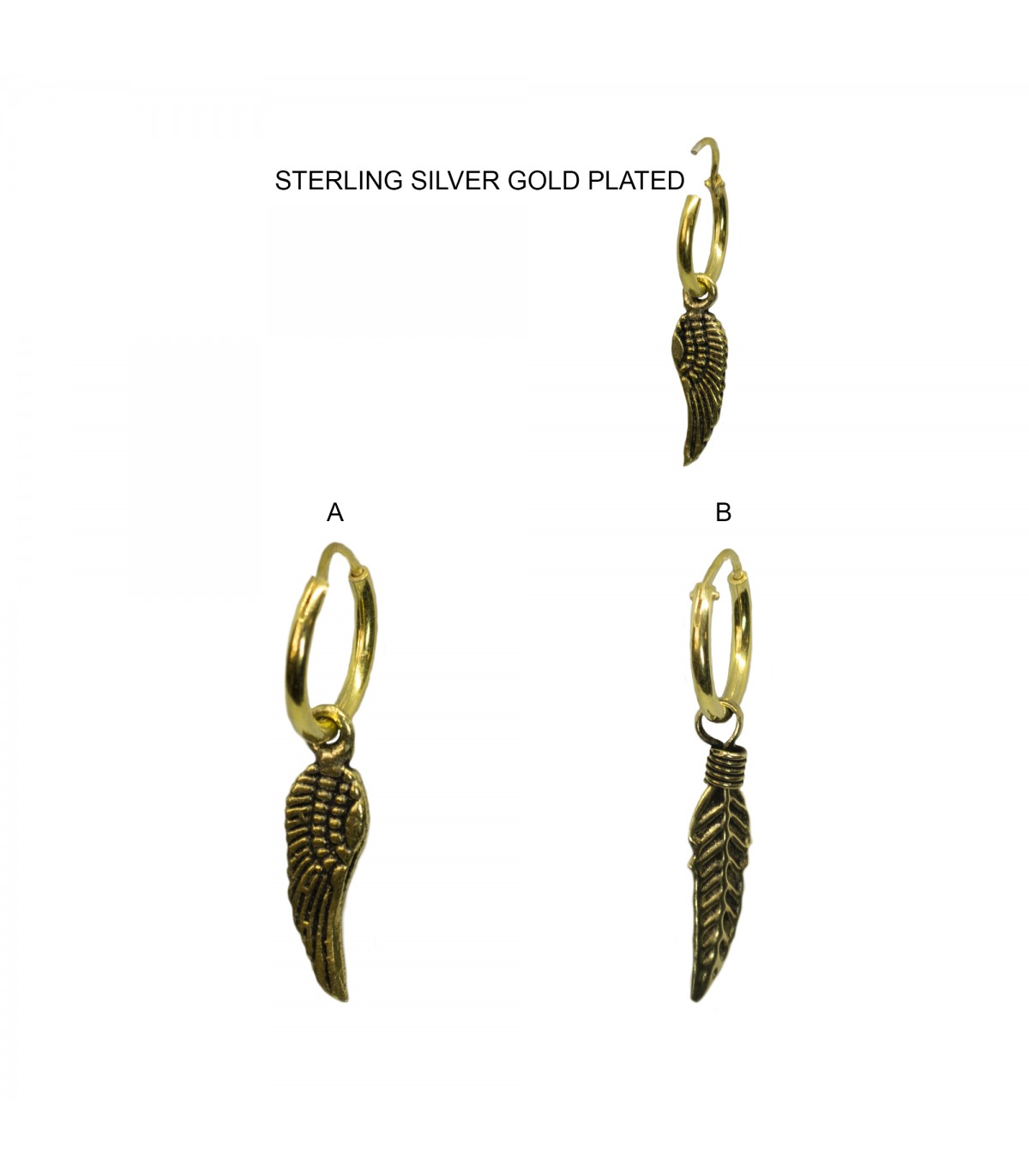 Aro de plata chapado en oro de 10 mm de diámetro y 1,2 mm de grosor con colgante, de ala o pluma.