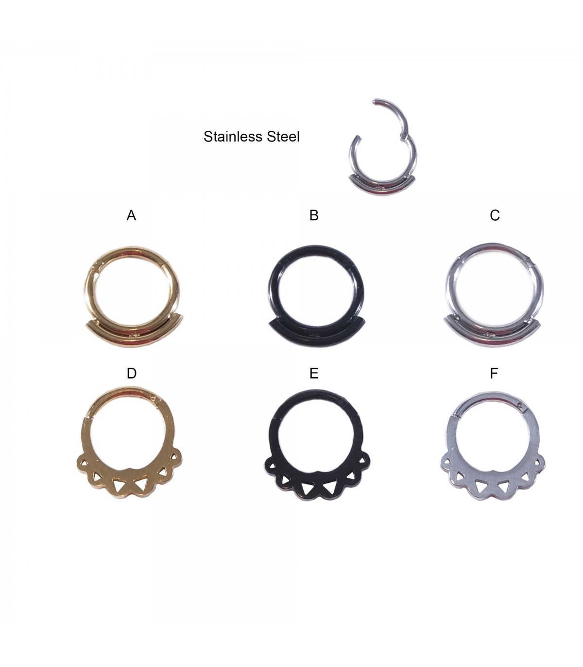 Body piercing de acero, con barra de 1,2 mm y diámetro de 8 mm,  en tres colores (acero, negro y dorado) que puede usarse para el Tragus, Helix, para la ceja, para el labio, para la nariz y como pendiente normal.