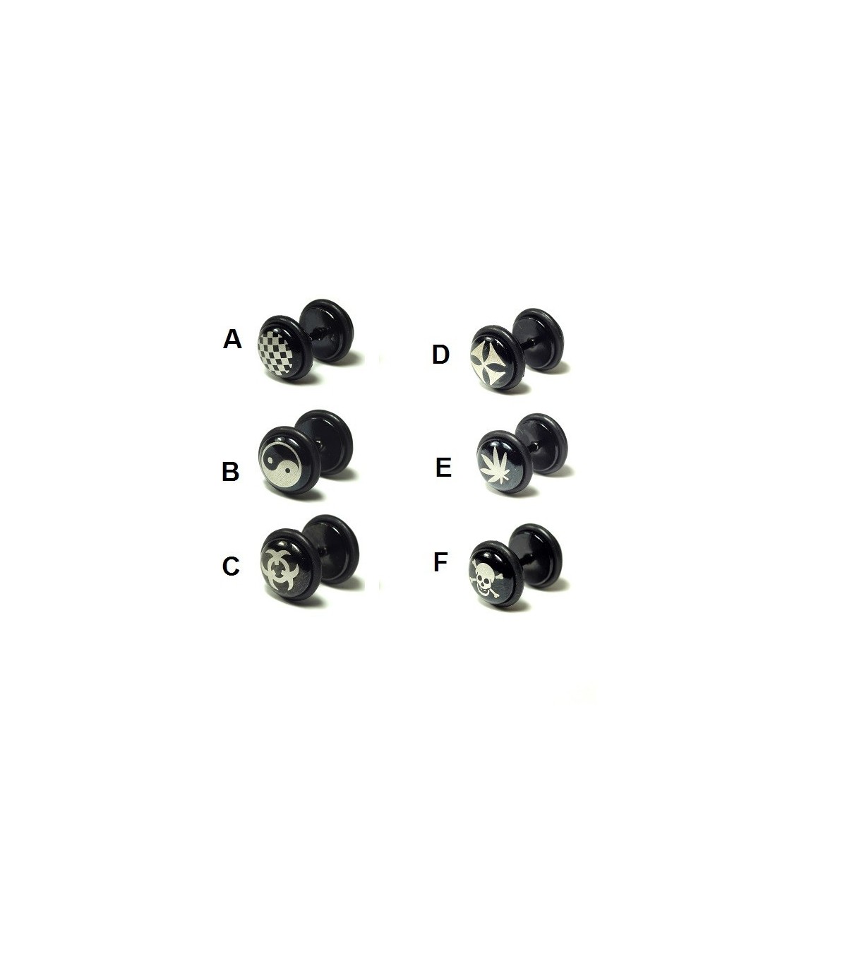 Faux piercing plug en acier, gravé au laser, en couleur noir et acier, 10 mm, 6 modèles différents.