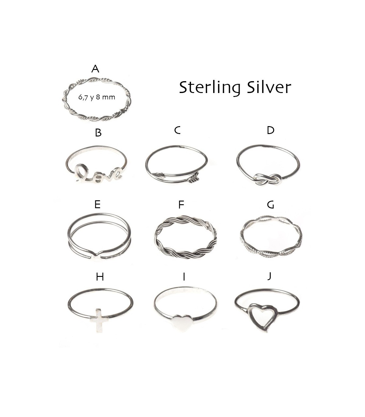 Bague en argent, 9 modèles, en trois tailles de diamètre 6, 7 et 8 mm.