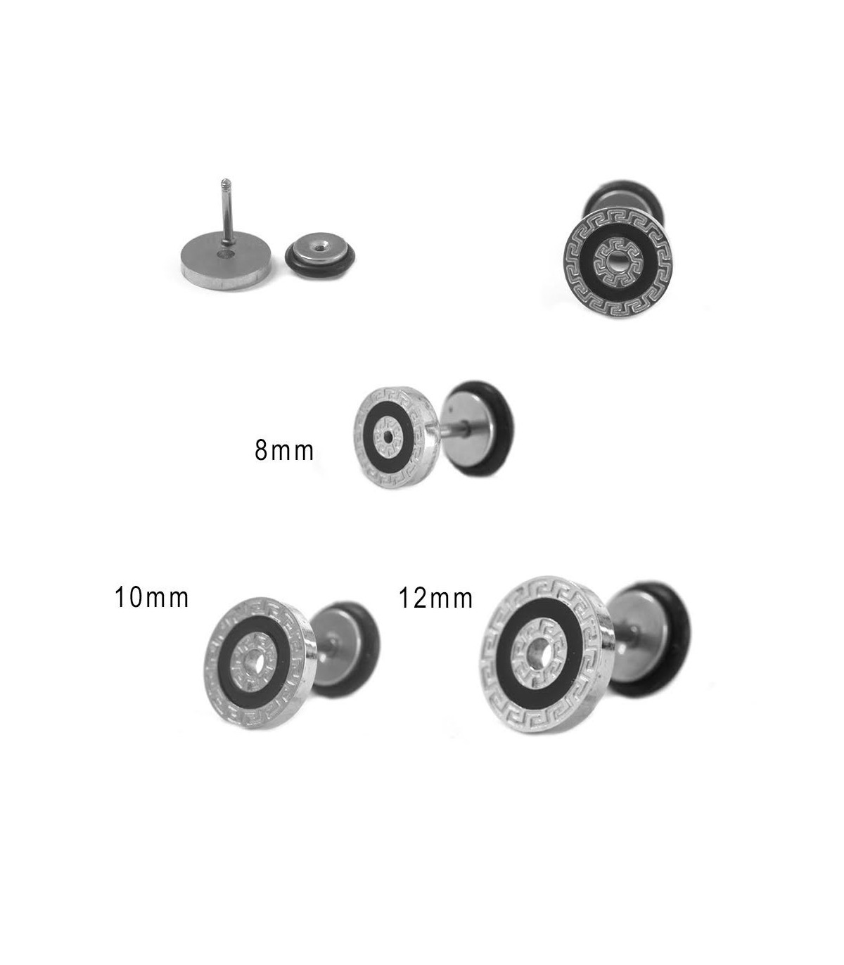 Faux piercing plug en acier en couleur noire, trois tailles 6, 8 et 10 mm.