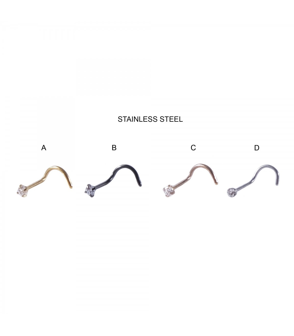 Piercing Nostril en acier pour le nez dont la barre de 0,8 mm est curvée en spiral avec gemme Swaroskvi de 2 mm blanche.