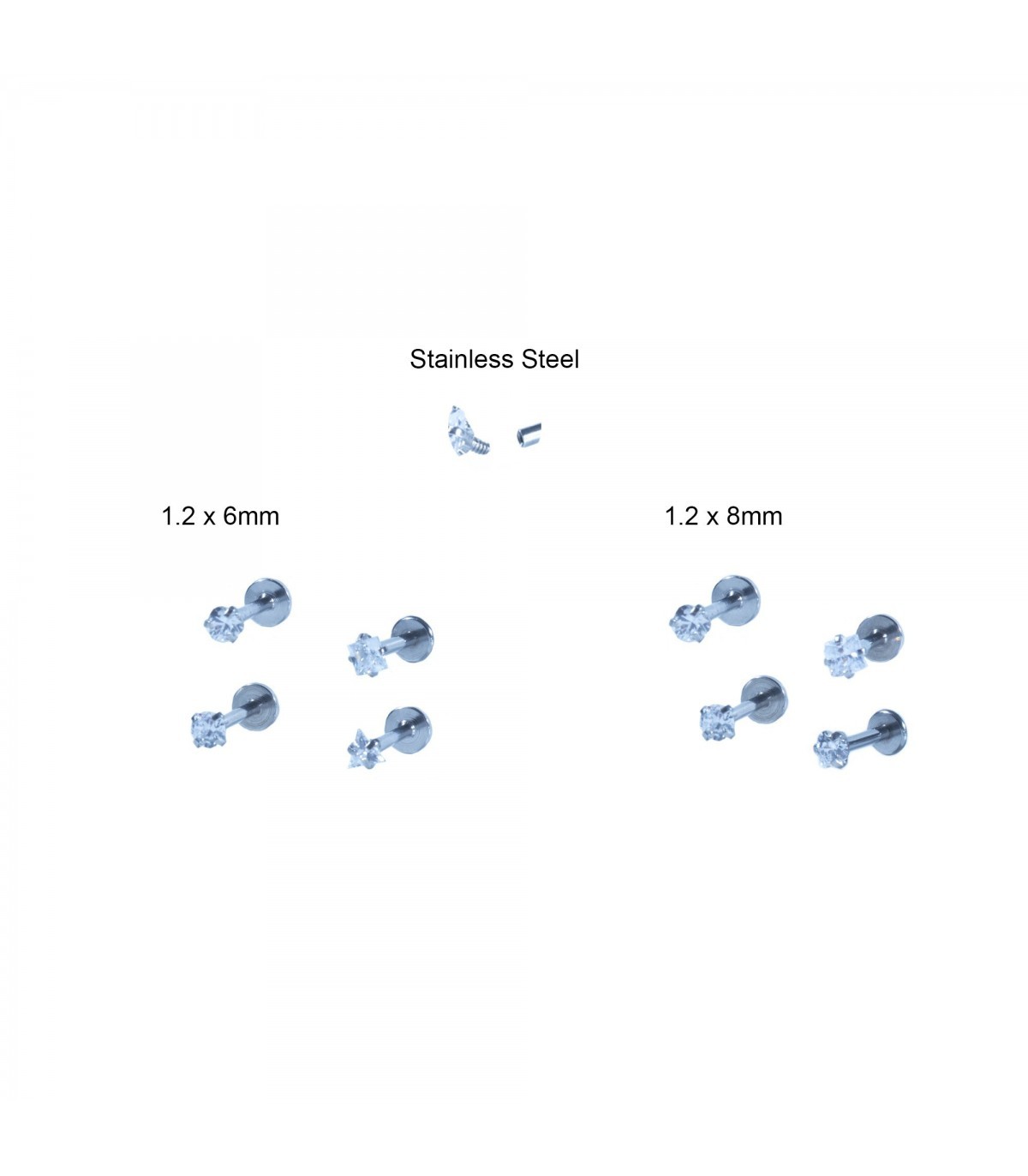 Piercing en acier qui peut être utilisé en tant que Tragus, Helix ouvLabret dont la tige est de 1,2 mm avec zirone blanche endeux tailles de 6 et 8 mm.